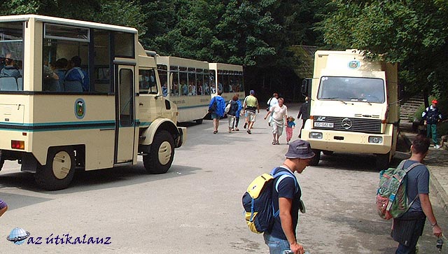 A szerelvényként összekapcsolt kisbuszok az indulási állomásnál