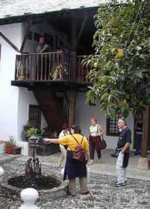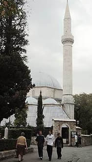 A ház emeleti szintjéből kiugró, lábakon álló hagyományos erkély alapján valószínűleg könnyen megismerjük. 2004-ben még egy idős néni, ha jól értettem, a Biscevic család utolsó leszármazottja fogadta a látogatókat, aki a bemutatásért kapott önkéntes adományokból próbál megélni. Ha visszatérünk a Brace Fejica utcába, jobbról betérhetünk az egyik legszebb boszniai templomba, az 1557-ben épített Kradzsoz bég dzsámiba. Sajnos a fény közben megfogyott, így csak utcai képet tudok mutatni róla. Kútja, festett és üvegből készült díszei különösen látványossá teszik a templomot.