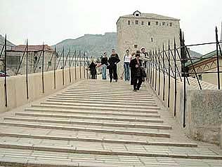 A híd 418 évig kapcsolta össze a város két felét. A nyugati oldalon a legutóbbi időkben főleg horvátok telepedtek le. Ennek is volt köszönhető, hogy 1993. november 3-án a boszniai horvát alakulatok egyik parancsnoka szétlövette az építményt. A világot megdöbbentette az értelmetlen pusztítás. A háború lezárulása után nagy nemzetközi összefogás szerveződött, az újjáépítésérére. A folyóba zuhant hatalmas köveket például magyar műszaki alakulat közreműködésével emelték ki.