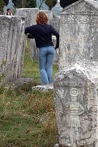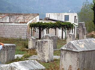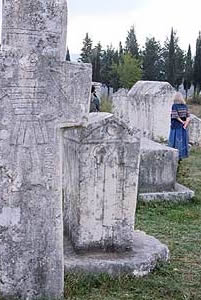 Más helyen már beszámoltam az eretnekeknek bélyegzett bogumilok hatalmas sírköveiről, a steccikről, amelyekre integető gyerekeket, felnőtteket, különböző motívumokat, sőt egész képregényeket véstek, hogy bemutassák azt a személyt, akinek a kővel emléket állítottak. A talán legnagyobb “eredeti gyűjtemény”, nekropola, azaz temető itt található. A kora mintegy ezer év. Közvetlenül az út mellett, jobboldalon van, így könnyen észre vehetjük. (A tasovicici elágazótól kb. 23. kilométerre.) Előtte egy romos házcsoport, valószínűleg a háború alatt szétlőtt vendéglő látható, a másik oldalon pedig egy cigánytábor.
