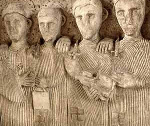 Az érdekes motívumok között az egyik domborművön meglepve fedeztünk fel két horogkereszthez hasonló ábrát. Persze nem az volt, a hajdani napkultusz logóját véste valaki kőbe. (A fotón is látható, hogy a “napkerék” küllői fordított irányba állnak, mint a fasiszták által később használt jelvényen.)