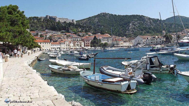 Milnából látogattunk el a sziget fővárosába Hvarba. Körülbelül 3500 lakosa van, egy széles öböl mentén helyezkedik el, az öböl előtt a gyönyörű Pakleni-szigetek találhatók. Nem messze a várostól, a Markova-barlangban újkőkori fegyverek, edények és szerszámok töredékeit találták meg, eszerint a környék több mint hétezer éve lakott. A középkorban Lisna, Lesna néven volt ismert. Az 1200-as évek végén vette át az addig Hvarként, ma már Stari Gradként ismert várostól a fővárosi rangot és a Hvar nevet. Először a Restaurant Panorama mellől, fentről tekintettünk le a Pakleni Otocira és Virára. Hvar diszkréten megbújik a dombok alatt. Fantasztikus a kilátás onnan, kellemes lehet itt ebédelni vagy vacsorázni.
