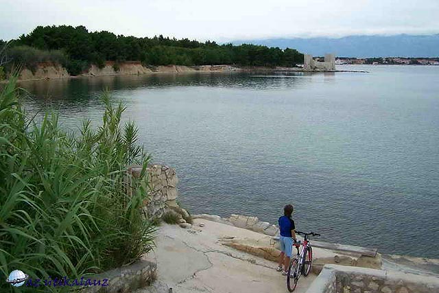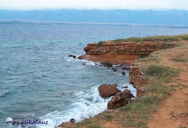 A tulajtól kaptunk egy részletes térképet a szigetről. Azon két, autóval megközelithető látványosságot választottunk ki magunknak. Az egyik a sziget északkeleti részén lévő “vörös part” . Érdekes ez az omladozó vörös partszakasz, de veszélyes is, ne menjünk túl közel a széléhez! A háttérben Pag kopár szigete látszik, felette meg a Velebit-hegység.