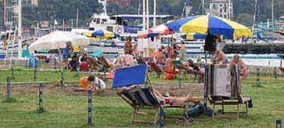 Strandolás Portorozsban egy másik strandon. A pirani busszal egy megállóval tovább utazva (a kikötőnél leszállva) érhető el a központi strand (Plaza Portoroz, a kikötőtől balra). Ennek a partja homokos,