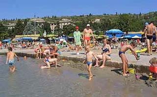 és néhány pálmafa is található rajta, de ezek nem adnak elegendő árnyékot, ezért érdemes napernyőt bérelni (saját ekcájg itt sem használható). Ennek a strandnak a vize lassan mélyül, és a tengerfenék itt homokos, ezért a gyerekekkel ez tűnt az ideális fürdőhelynek. Nem tudom, hogy csak a szezonvég okozta-e, vagy ennél általánosabb jelenség, de itt tűnt fel, hogy a víz meglehetősen koszos volt. Csikkek úsztak rajta, itt-ott kisebb nylonzacskókba, ill. műanyagpoharakba botlottunk. Talán ezért írta az útikönyvünk, hogy a szlovének piszkosnak tartják a tengerpartjukat, és inkább lemennek Isztria “romlatlan” horvát szakaszára, ha a tenger mellett kívánnak üdülni, a sajátjukat pedig meghagyják a németeknek és az osztrákoknak…