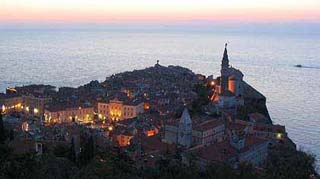 Este barangolás Piranban. Felmásztam a középkori városfal (főleg a XIV-XV. századból) megmaradt szakaszára. Ez messze a harangtorony fölé magasodik, és az északi bástyáról egyszerre látni Trieszt és Horvátország fényeit.