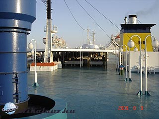 18.30-kor megjött a komp. A kocsival beálltam a sorba, ahol a kikötésre várakozók kezdtek sorba állni az autóikkal, de sokan csak úgy gyalogosan. Az autóval csak én mehettem be a raktérbe, a feleségem és a lányom gyalog mentek fel a kompra. A kompra csak “deck – fedélzet” jegyet vettünk, ami azt jelenti, hogy nem volt külön kabinunk. Mivel a rakteret lezárják, fel voltunk pakolva egy külön táskába: inni, enni való, pokrócok, hálózsák, kártya, stb. Ezt is az internetről tanultam tapasztaltabb kompos utazóktól.