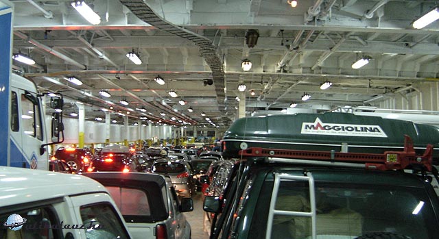 A kompban két szint van az autók részére. Az első szinten vannak a kamionok (vagyis inkább csak a trélerek, mert a vontatók ritkán utaznak), teherautók, karavánok. A személygépkocsikat egy szinttel feljebb irányítják. Mi a KRITI I nevű komppal mentünk. A hajó 192 m hosszú, ebből kb. 150 hosszú a raktér az autóknak.