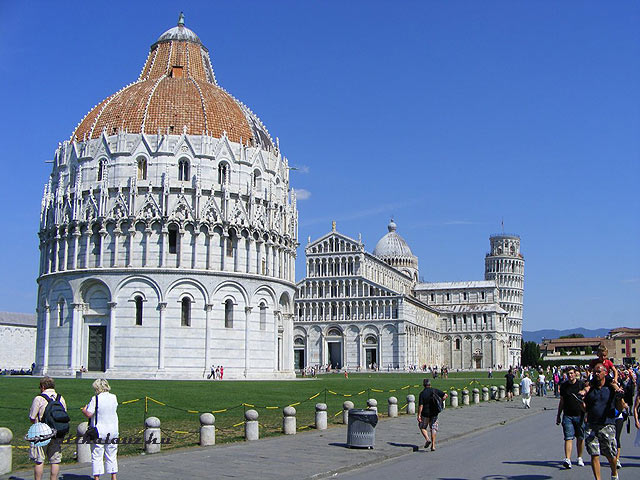 A Venezia -Firenze útvonalat követve jutottunk el Pisa városába. Már itthon a központi parkoló címét vittük be a GPS-be így rövid idő alatt bevitt a városba és még szabad hely is volt vasárnap 3 órakor. Innen néhány száz méter gyaloglás, és máris meg lehet csodálni az európai építészet egyedülálló remekét. Nem véletlen, hogy a hely neve is “A csodák tere”. Többféle jegyet lehet venni, erről megfelelően tájékoztatják a látogatókat. A legegyszerűbb és legolcsóbb a “Battistero”, amely ez mellett a Dómra is érvényes. Látogatható még a temető és fel lehet menni a harangtoronyba is (Ferde torony). A Duomo a 12. században épült – nem meglepő: pisai stílusban, amit aztán számos helyen kezdtek el másolni. Egész Korzika és Szardínia ilyen stílusú templomokkal van tele. Csodálatos, márványból faragott szószékét Giovanni Pisano alkotta. A Battistero gyönyörűen díszített külsője valamivel szerényebb belsőt takar, de a szószéke ennek is gyönyörű. És ott van a mindenki által ismert Ferde torony. Ami akkor is csodálatos ha nem rontották volna el már az építés során, amikor alultervezték az alapozást. Gyönyörű napfényes időben remek felvételeket készítettem erről a nem mindennapi térről.