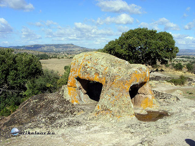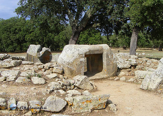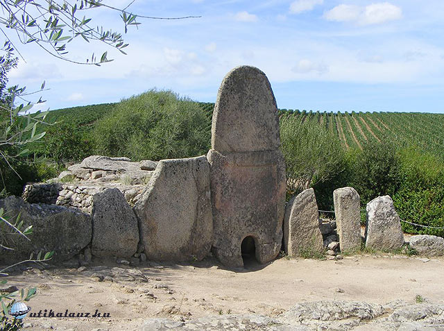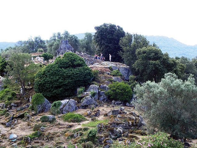 Nem kevés bosszúság után, de a legrövidebb és legjárhatatlanabb útra csalt be megint minket a GPS, épp akkor, amikor már azt hittem, sikerült jó útra téríteni. Végül csak odavergődtük és egy para-tölgy ligetben érdekes menhíreket, dolmeneket, úgynevezett “tündérházakat” (Domus de Janas) és kút-templomokat tekintettünk meg. A temetkezési helyeket először az “Ozieri kultúra” lakosai használták, itt található egy helyen a legtöbb menhír a szigeten. A II. számú síron látszik a megmunkálás minősége, így feltételezhetően egy kiemelkedő személyé lehetett. Erősen lepusztult állapotban van még néhány folyosós sírhely is.