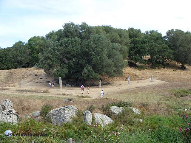 Az ezeréves olajfa, körülötte torreán harcosokat ábrázoló menhírek