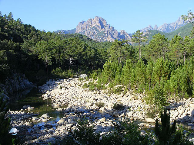 A Restonica folyó medre a kerek hordalékkövekkel