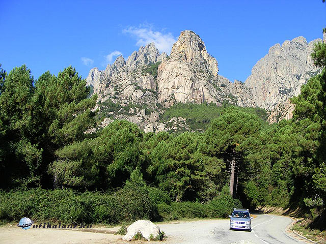 Az út egyébként a Lac du Melohoz vezet. Mintegy 6-7 km után visszafordultunk és nekiindultunk a sziget belsején átvezető útnak, amely érinti Calacuccia települést és a felső tavat. Nem jártunk messze a sziget legmagasabb csúcsától, a Monte Cintotól, mely látványosan emelkedett ki a környékbeli csúcsok közül a maga 2706 méteres magasságával. Mondani sem kell, hogy sehol nincs 100 méternyi egyenes útszakasz. Ennek ellenére a helyiek igen merészen vezetnek, még akkor is, ha ismerik az utat. Nagyon bosszantó, hogy levágják a kanyarokat, akkor is, ha előre láthatóan egyszerre érnek oda a szembejövővel. Ezért fokozott óvatossággal vezessen mindenki. Mi inkább látni akartunk, ezért ha utolértek és láthatóan sietős volt a vezetőnek, akkor az első alkalommal elengedtük őket. Így eggyel kevesebb felé kell figyelni és a másik is mehet a dolgára. A hegyi utak, (szinte más sincs) nagyon változó minőségűek és szélességűek. Kiváló minőségű szakaszok fordulnak hirtelen alig járható szakaszokba. Az útmenti korlátok szinte teljes hiánya az egész szigetre jellemző. Több helyen annyira szűk az út, hogy két kocsi csak nagy figyelemmel és jelentős lassítás, akár megállással fér el egymás mellett. Beláthatatlan kanyarokban ilyen helyeken célszerű használni a dudát, így figyelmezetve a szembejövőt, hogy mi is jövünk. Sok helyen vannak szabadon kószáló háziállatok, kis testű tehenek, disznók, birkák. Ezeket gazdájuk reggel kiengedi és legelnek amerre tudnak. Fokozottan kell figyelni erre is.