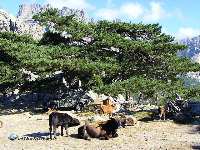 Vihar-tépte fenyők között egy tehéncsorda a Solenzara völgyben