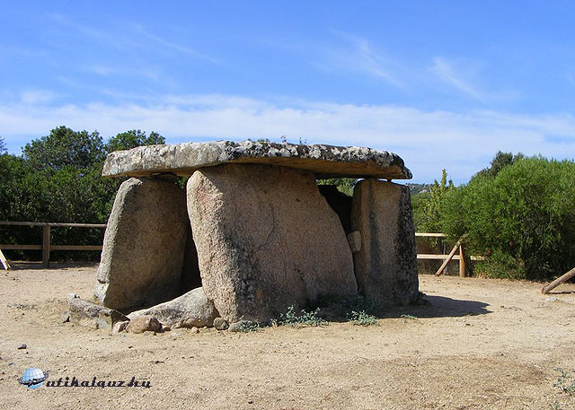 Kényelmesen megreggeliztünk és irány Porto Vecchio, ami pénteken kimaradt, mert már későre járt az idő. Kissé borongós időben sétáltunk egyet a városban és rövid idő múlva ismét Bonifacióba érkeztünk. Egyenesen a kompkikötő előtt parkoltunk le, majd tettünk még egy rövid sétát a városban. 11 óra után befutott a komp Santa Terezából és hamarosan megkezdődött a behajózás. Elsőként a motorosokat engedték fel, hogy rögzíteni tudják a motorokat, mert a tenger közepesen hullámzott és ez csak egy kis játék komp volt. Pontosan indultunk és ötven perc múlva már partot is értünk az Olaszországhoz tartozó szigeten. Változóan felhős ég és erős szél mellett indultunk az Arzachena melletti úgynevezett Tomba dei Giganti, azaz az óriások sírja megtekintésére. Ezekből a nuraghe korszakban emelt sírokból elég sok található a szigeten, ezek egyik meglehetősen épen maradt példányát, a Coddu Vecchijut néztük meg. Igen érdekes kialakítású temetkező hely volt; egy félkörív (Exedra) közepén egy jó magas, élére állított lapos kő mögött helyzeték el a hosszú sírkamrát, amelyet nagy lapos kövekkel fedtek be. A bejáratul szolgáló nyílás viszont aránytalanul kicsi még egy normál emberi mérethez is, ezért feltehetően csak a hamvakat helyezték el belül.