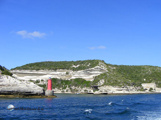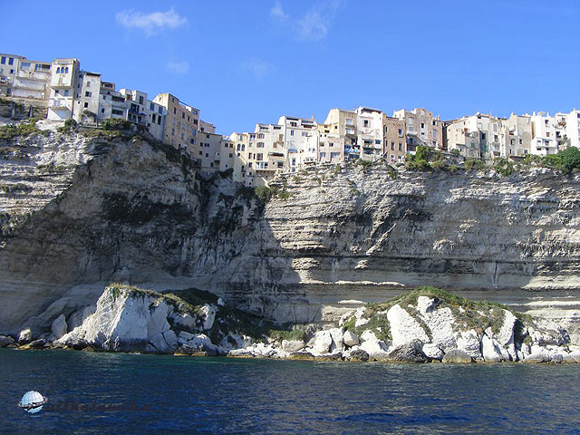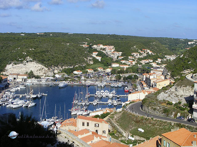 Mivel szép tiszta idő volt a távolban látni lehetett a l’ Uomo di Cagna csúcsát, amelyen egy 300 tonnás ingókő pihen. Aztán egyszer csak hófehér mészkősziklák közé hajtottunk és megérkeztünk Bonifacioba, mely ezekre a kréta-sziklákra épült. A városba érve egy nagy központi parkoló van a kikötő mögött, a gépkocsit a legcélszerűbb itt hagyni és gyalog bejárni a várost. Ez kihívás lehet azok számára, akik nem szoktak a mozgáshoz, ugyanis az óvárost csak meredek lépcsők megmászásával lehet megközelíteni. A kikötő hatalmas területen fekszik és a világ legmesszebb tájairól is láttunk itt hatalmas hajókat. Ezek már nem is yachtok voltak, mert akkorák is voltak köztük, mint egy kisebb cirkáló. Sokan érkeztek Ausztráliából és Új-Zélandról. A kikötői soron véges-végig bárok, éttermek, fagylaltozók sorakoztak és üzlet mindenfelé. A várost meg lehet tekinteni a tenger felől is, ehhez a számtalan hajótúrák egyikére kell csak befizetni. Okos megoldással nem egymás ellen versenyeznek a hajó-tulajdonosok, hanem egy központi jegypénztárnál folyamatosan töltötték a hajókat, így mindenki sorra kerül és mindig teli hajók futnak ki. Mi is befizettünk egy ilyenre, 17.5 Euróért fejenként, de a látvány megérte. Először végighajóztunk a védett öblön, ahol a csodálatos krétafehér falak leszakadásait és az erózió formálta alakzatait néztük meg, majd benavigálták a hajót egy barlangba (Grotte du Sdragonato), amelynek valamikor leomlott a tenger felőli oldala és később pedig a teteje, és így bent is látható volt a kék égbolt. Amolyan kis kék barlang. Végigmentünk a közeli csodálatos öblökön, majd a hajó visszaindult a kikötő felé, de előbb még a város alatti hatalmas sziklafalat nézhettük meg . Itt van a Grotte St. Antoine is , ami kis képzelőerővel egy napoleoni kalapra hasonlít, majd a hajó lassan elhúzott a 60 – 70 méteres magasságban, a fehér sziklákon elterülő óváros alatt. Hihetetlen látvány nyújtott a szinte lebegő házak rengetege. Az biztos, hogy ott nem sokat labdáznak a gyerekek. Megtekintettük az Aragon lépcsőt, amelyhez az óváros előtti térről lehet lemenni majdnem és levisz majdnem a tengerszintig. Vállalkozó kedvűek némi belépődíj ellenében megnézhetik a tengert egy kis kilátóról és megmászhatják oda is vissza is a 187 lépcsőfokot. A hajó ezután visszaindult a kikötőbe. Mintegy 45 perc alatt csodálatos látnivalókban gyönyörködhettünk.