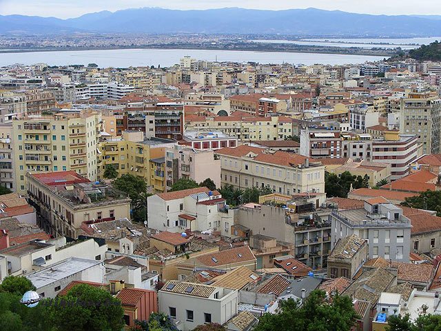 Cagliari, a keleti városrész színes házai, háttérben a tenger