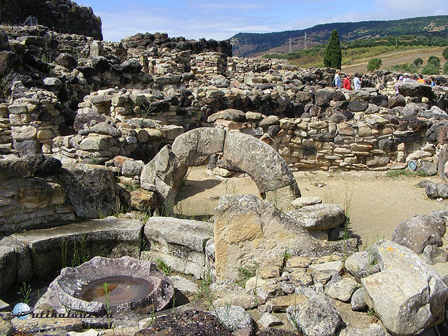 Ezek közül a Su Nuraxi együttese a legnagyobb és a legimpozánsabb. Mire megérkeztünk egy hirtelen jött zápor éppen elmosta ez előttünk levő csoportot. A húsz perccel később induló csoportunk már verőfényes napsütésben tekinthette meg kívül és belül ezt az egykori települést. Angol nyelvű idegenvezetéssel mentünk és az érdekes, ábrákkal illusztrált bemutató során elmesélték a feltárás körülményeit, hogyan néztek ki valójában ezek a tornyok és mekkora volt a körülette levő település. Elmondták, hogy három fő időszak alatt történt az épületegyüttes felépítse. Először a 3 szintes központi torony épült meg, majd ezt követte a négy külső bástya, még később a külső épületek sokasága. Látható volt a kisebb kör alakú házak alapja és a bennük levő kis szentélyek, amelyek fő helyen álltak. Ezeket az épületmaradványokat csak fentről lehetett igazán látni. Ez is az UNESCO világörökség részét képezi.