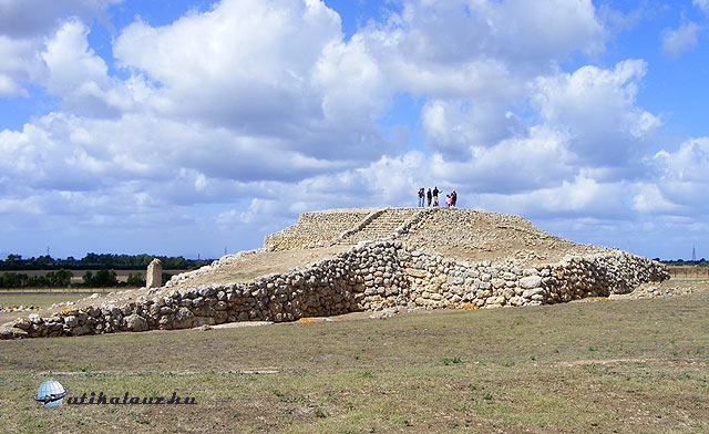 Kora délután indultunk a közeli Monte d’Accoddi lépcsős piramisához, amely a Porto Torres felé vezető úton egy Ottava nevű település után található. Igen, ez nem elírás, Európában ez az egyetlen ilyen építmény és még az egyiptomiaktól is régebbi. Építését i.e. 3300-3000 körülire teszik. Igaz, hogy méretében messze elmarad az egyiptomiaktól, de alapterülete 39 x 26 méter és közel 6 méter magas. Építése két fő fázisban történt. Először az alsó szint épült meg nagy szabálytalan kövekből, egy rámpával és a nagy lapos tetőn egy szentéllyel vagy oltárral.