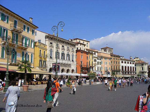 Rövid séta után értük el Verona legszebb terét a Piazza delle Erbét, ahol a mai napig állandó piac van, számtalan fehér sátorból kínálják árujukat az itteni kereskedők. Az egykori velencei uralomra utal Szent Márk oroszlános oszlopa és mellette a piac kútja, amelyet a “Verona úrnő” koronás szobra díszít. A tér közepén az un. “Tribuna”, amelynek baldachinja alól hirdették ki a törvényeket a középkorban.