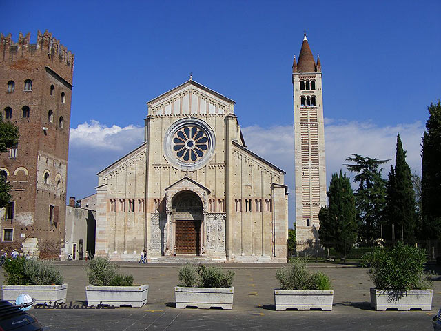 Túránk utolsó látnivalója a San Zeno bazilika, a város másik felén található, melynek helyén már a 4. században is felszentelt hely, Szent Zéno oltára állt. A jelenleg látható épületet a 12. században fejezték be, ebből az időből valók a szépen helyreállított falfestmények is. A csodás homlokzat kiválóan fényképezhető az előtte levő nagy térről, amely egyben parkoló is. 72 méter magas harangtoronnyal rendelkezik és a templomból nyíló szép kerengő is található itt. Altemploma is figyelemre méltó, a sok-sok oszlopon nyugvó boltozattal. Itt több szent sírhelye is látható, köztük Szent Zénoé, aki Verona első püspöke és patrónusa volt.