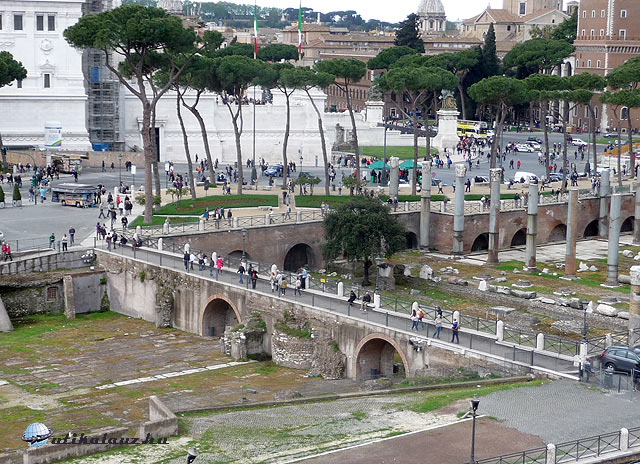 Még azok az épületek maradtak meg jobb állapotban, amelyeket a kora keresztény korban kisebb átépítéssel keresztény templommá alakítottak át. Jelenleg is ásatások folynak a Fórumon, illetve rekonstrukciós munkák. Legjelentősebb Antonius Pius és Faustina templomának tatarozása. A tömeg folyamatosan áramlott, különösen az iskolai csoportok voltak feltűnőek. Gyakran azonos sapkában, vagy azonos trikóban voltak – így könnyebben találták meg csoportjukat. Minden gyereken hátizsák volt. Az út szélére leülve fogyasztották szendvicseiket. A nagyobbaknak magyarázott a tanár, a kisebbek csak rohangáltak. Egész délután sétáltunk a romok között. Nem tudtuk, melyik rész is tetszett jobban: a diadalívek, a megmaradt, vagy ledöntött oszlopok, Maxentius bazilikájának hihetetlen méretei, vagy a Vetsa-szűzek templomának kecsessége.