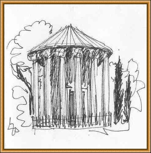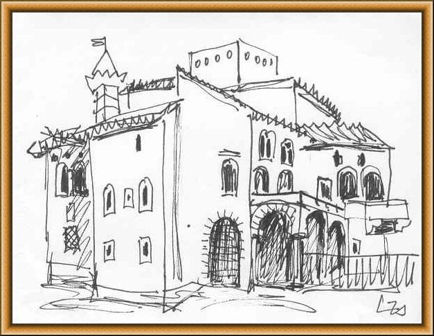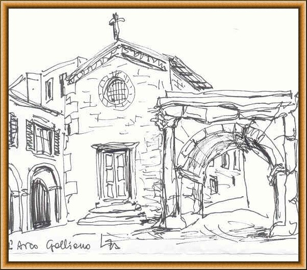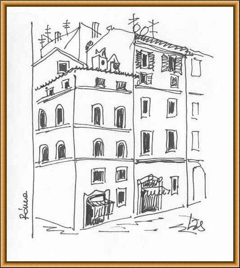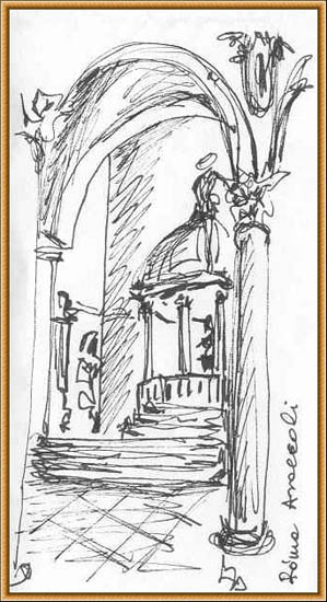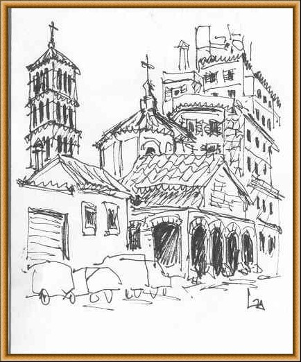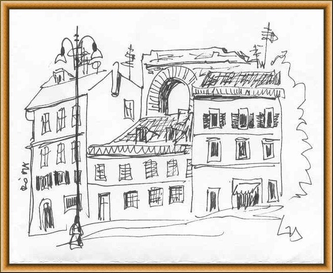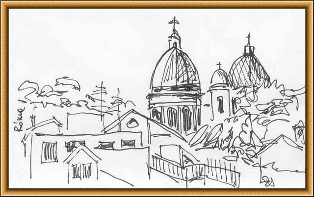 A második napon férjemnek hivatalos szakmai programja volt délelőtt, ezért a környék felderítésével egyedül foglalkoztam. Amíg férjem a szakmai kapcsolataira várt a Via Cesare Balbin, én szemközti templomocskát rajzoltam.