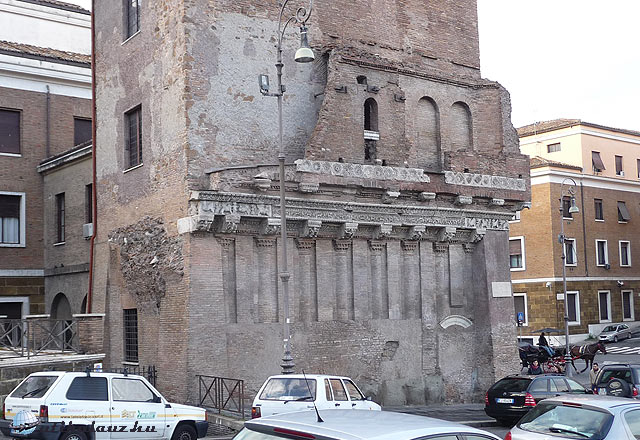 Körbe kerültük Viktor Emmánuel hófehér emlékművét. Mindenünnen látni, jó tájékozódási pont. Nappal hófehér színével, este kivilágítva uralkodik a városon. Elsétáltunk a Capitoliumra vezető lépcsők alatt és alig hagytuk el a Tarpei sziklát, máris feltűnt Marcellus színháza. Két emelet magas az eredeti épület, az utolsó szintet később építették bele. A valaha nyitott árkádsorban most ablakok nyílnak.