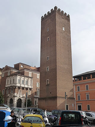 A teret északról a XII. századi Crescentiusok háza zárta. Jól láthattuk, hogyan használták fel az egykori építők az ókori maradványokat. A hajdani oszlopok, faragások párkányok alkotják a falat.