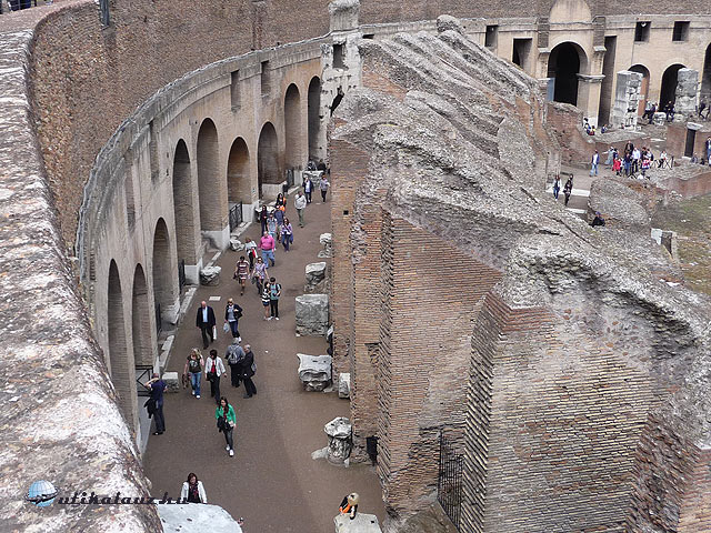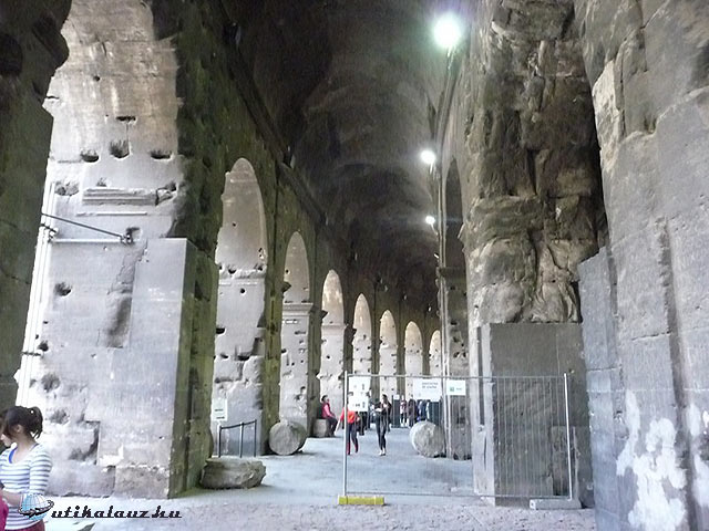 Innen már sietnünk kellett, mert előre megrendelt jegyünk volt a Colosseumba és a Forum Romanumra (olaszosan Foro Romano). Amikor még otthon interneten megrendeltem a jegyeket, szívtam a fogam, mennyire drága (a Colosseum nem csatlakozott a kulturális hét rendezvényihez). Külön 4-4 eurót számítottak fel az elő- és internetes rendelésre. Amikor megláttuk a végeláthatatlan sort a Colosseum pénztára előtt, úgy véltük, megérte. Persze bent is nagy volt a tömeg, de azért a Colosseum akkora, hogy elfértünk benne… Engem legjobban a hatalmas erős falak ragadtak meg, amelyre az egész épült. Itt az emberek általában átrohannak, keresik a feljáratot, pénztárt, audioguidot, stb. Pedig legalább olyan érdekes, mint a lelátó és aréna-rész. Nem győztem csodálni a római mérnökök teljesítményét.