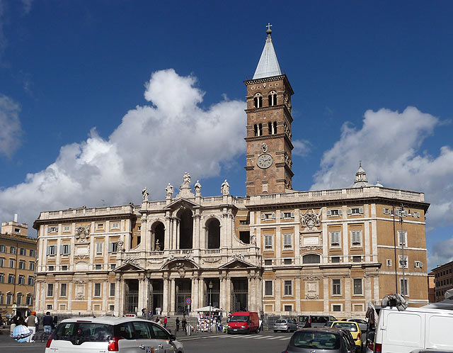 Utcánk végében a Santa Maria Maggiore templom magasodott. Itt találkoztunk először a művészettörténetben tanultakkal. A művtöri könyvekben azonban soha nem a külsejéről készült képeket találni, hanem a belsejéről. A mai templom helyén már a 350 körül templom állt, annak emlékére, hogy Liberius pápa álmot látott Szűz Máriáról. Ő jelölte ki a helyet, ott épüljön templom, ahol másnap hó esik. A kis templom egyre bővült. A főhajót 40 ion oszlop választotta el a mellékhajóktól. Az apszis és a kereszthajó a XIII. században épült, (ennek a képe szokott a művészeti albumokban előfordulni), ebből az időből származik a sok szépséges mozaik és a cosmata padozat is. A szép román harangtorony a XIV. században épült hozzá. A későbbi korok sem maradtak ki az építkezésből: a XV. században aranyozott kazettás mennyezetet kapott a főhajó. A XVI. században reneszánsz kápolnák épültek a kereszthajóban. A XVII században barokk homlokzatot építettek elé, a XVIII. században a másik oldalára áldásosztó loggiát.