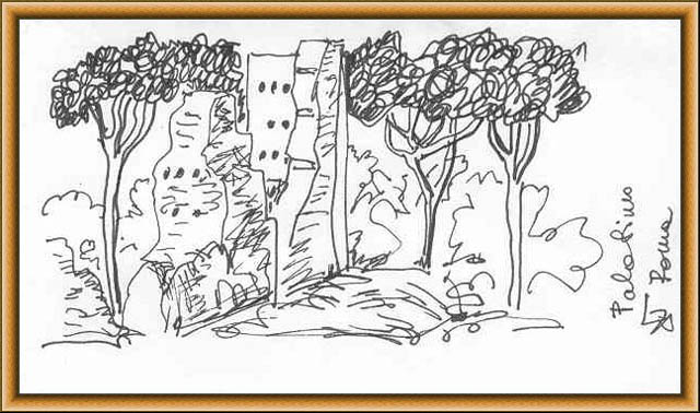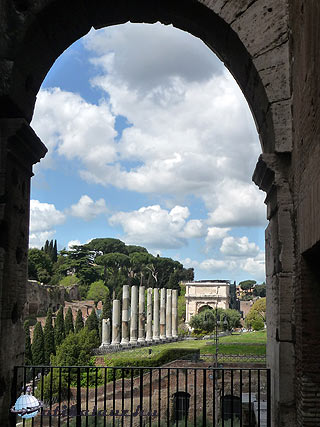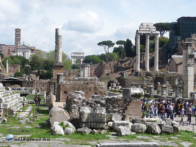 A Palatinusról lankásan lejtő sétaút vezet át a Forum Romanumra. Itt is mindenütt emberek nyüzsögtek. Az útikönyvek térképei segítettek a helyszínek azonosításában.