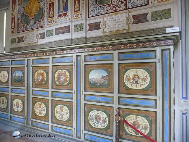 A Kápolnából újra hosszú galériákon keresztül értünk vissza a fogadóépülethez. A termekben csodálatosan festett szekrények valamilyen gyűjteményt (iratokat?) rejtettek. Mindegyik szekrényen más festés díszelgett. Valahol a hosszú teremsor közepe táján könyvesboltot találtunk, remek kínálattal.