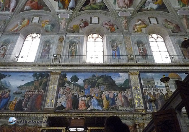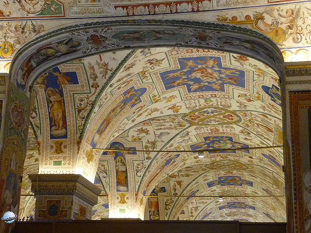 A Pio Clementino után lehet elágazni a Museo Etruscoba. A sok szép etruszk váza, urna után visszatértünk a Kandelláberek galériájába, majd folytattuk a Térképek galériájával. A tömeg itt is lépésben csoszogott. Nem lehetett lemaradni, vagy előzni. A galériák mennyezete csodálatos volt. A baloldalon nyíló ajtók festése lenyűgözött: nem volt két egyforma, csak stílusuk hasonlított egymásra. A hosszú teremsor végén dönteni kellett, egyenesen a Sixtusi kápolnához állunk sorba, vagy eltérünk balra. Így útba ejthettük Raffaello által festett négy termet (a másodikat éppen tatarozták), majd a Borgia lakosztályokat néztük meg. Bonyolult lépcsőkön, termeken vezettek keresztül fel-le, a termekben, folyosókon a pápának adományozott modern képeket állították ki. Végül egy meredek lépcsősor végén beléphettünk a Sixtusi kápolnába. Mint a hetes buszon, egymáshoz szorulva nézhettük meg a freskókat. Persze az egészen Michelangelo mennyezetfreskója és az Utolsó ítélet uralkodott. Csak ezután vettük csak észre – az oldalfalak képeit. Szebbnél-szebb reneszánsz képek! Perugino, Ghirlandajo, Boticelli, Roselli, Signorelli és Michelangelo képei.