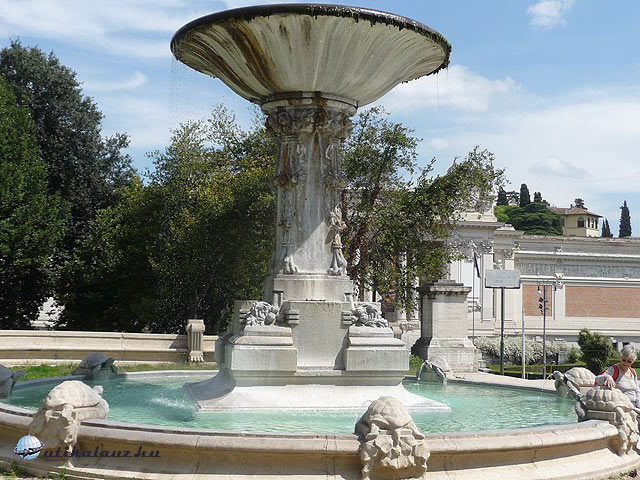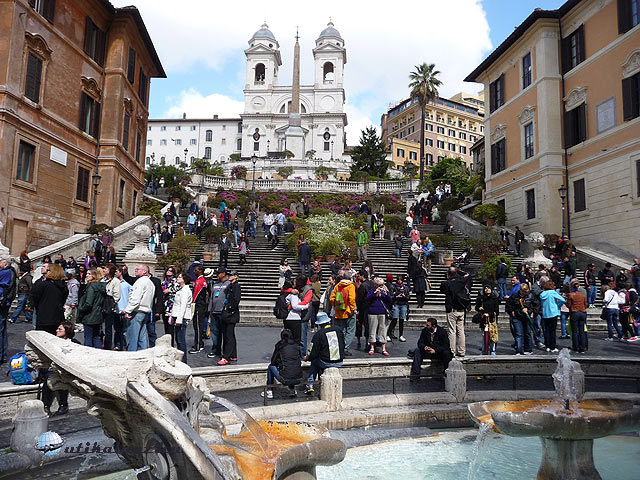 A Spanyol lépcsőn a turisták üldögélni szoktak. A korábbi zápor miatt azonban a lépcsők nedvesek voltak, így az emberek fel-alá áramlottak. Mi is. A virágdísz imponáló, a lépcső alján a hajó alakú szökőkút roppant érdekes. Az angol teaház sokat veszített érdekességéből: a turisták tömege elkoptatta. Sokkal kevesebben nézelődnek szét a lépcső tetejéről, és sétálnak a Pincio irányába. Pedig csodás a kilátás. Róma hatalmas házrengetege alattunk fekszik, büszkén emelkednek ki belőle a kupolák. A Viktor Emánuel emlékmű fehér tömbje jó tájékozódási pontot kínál. Könnyen tájékozódunk, merre is jártunk már.