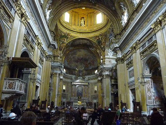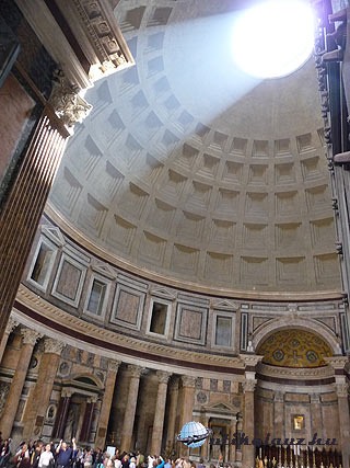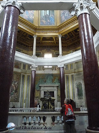 A vásárcsarnoktól lesétáltunk Traianus oszlopához, közelről megcsodáltuk Traianus fórumának oszlopait. A Piazza Venezia nagy felfordulással fogadott: építik a 3. metróvonalat. Gondolom, nem lehet egyszerű ott építkezni, ahol minden ásónyom antik köveket fordít ki a földből… Mivel nyitva találtuk a Santa Maria Loretto templom kapuját, bementünk és rögtön beleszerettünk a kupolájába.