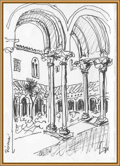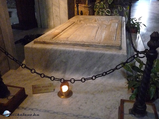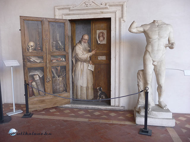 Később persze átalakították és bővítették, (úgy látszik ekkoriban nem becsülték eléggé Michelangelot) pedig már így is elég nagy volt. Ha keresztül megyünk a templomon, az egyik mellékhajóban kiállítást láthatunk a tervrajzokból. Bátran menjünk tovább a kínálkozó ajtókon. Kis udvarra jutunk, majd egy közön át kibukkanunk Via Barbierire. Nem a Santa Maria degli Angeli az egyetlen templom, amely a fürdő épületeit használta fel. Az Aula Ottogona is templomot rejt magában. Nagyobb szerencséje volt Michelangelonak a fürdőkomplexumban létesült kolostor kerengőjével: Ez ma is változatlanul áll, a Museo Nazionale Romano részeként. A kerengő kőtárként működik, itt akadtam a festett barátra is.