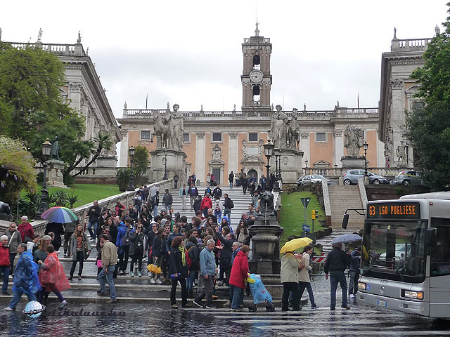 Kora délelőtt, eső után is nagy a tömeg a Capitoliumra felvezető lépcsőn