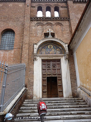 A tér déli felén áll a Santa Maria in Cosmedin. Forgalmas úton kell átkelni a Triton kút mellett. A templom előtt hatalmas tömeg: a templom nyitott előcsarnokában van a Bocca della Verita, azaz az Igazság szája. Nekem végtelenül furcsának tetszett, hogy emberek képesek sorba állni, várakozni, hogy a kezüket a maszk szájába dugják (a hiedelem azt tartja, a hazugok ujját leharapja a maszk). Szerencsére a templomhoz nem kellett sorba állni. Már a belépés után feltűnt a szép padlózat.