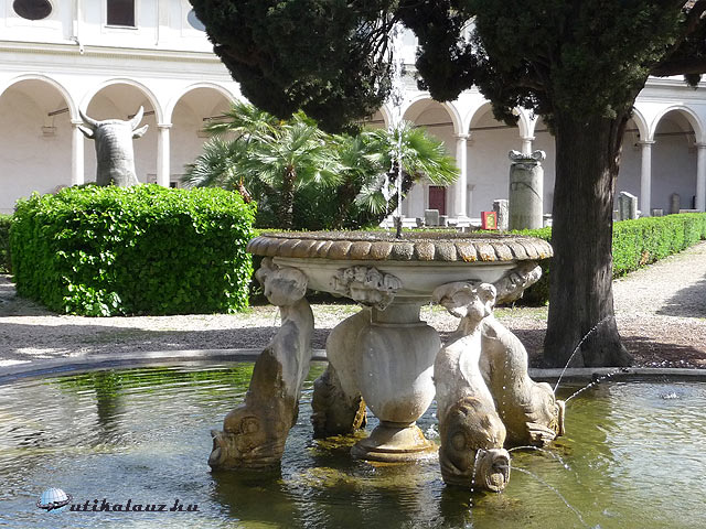 Az ötödik nap metrózással kezdődött: kiutaztunk a falakon kívüli Szent Pál templomba (San Paolo fuori le Mura). A metró itt már a felszínre jött, azonnal megláttuk a templom és kolostor hatalmas tömbjét. 1823-ban ugyan leégett, de néhány év alatt régi pompájában újjá építették. Sokan ezért leszólják, nem „eredeti”, de nagyon szép. Megmaradt bazilikális elrendezése: az öt hajót gyönyörű oszlopok választják el. Az ablakokat csiszolt alabástrom alkotja. Az apszisban megmaradtak a mozaikok. Szt Pál sírja mellett ott ál a szépséges XII. századi gyertyatartó, Vasaletto munkája. A XIX. századi hozzáépítés leginkább a homlokzatot érinti. A mozaikok és az oszlopcsarnok, bár ragyogó hatású, de stílusában nem illeszkedik a templomhoz. Átvészelte a tüzet a kolostor kerengője. Karcsú, gyakran csavart oszlopok cosmata díszítéssel, szépen faragott oszlopfőkkel. Ugyanúgy Vasaletto munkája, mint a gyertyatartó. A kerengőbe és múzeumba külön jeggyel lehet belépni (2 €). Kedves néni ül a pénztárba. Mivel nem tudott visszaadni nagyobb címletű pénzünkből, kézi vezérléssel nyitotta ki az amúgy automata bejáratot, és kérte, váltsuk fel a pénzt és később menjünk vissza a belépő árával, de a kerengőt ne hagyjuk ki semmiképpen. A bazilika mellett találtunk is egy kávézót, ahol nem volt gond az 50 eurós. Volt már aprópénzünk, visszamentünk a kedves nénihez, aki annyira csodálkozott becsületességünkön, hogy megajándékozott két szépséges könyvjelzővel.