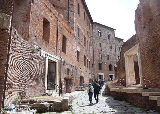 Persze, a középkorban is használták az épületet, mutatja a beleépült loggia, román ikerablak, lakótorony. Ma persze jól szervezett múzeum. Jó néhány lépcsőt meg kell mászni, mire bejárja az ember a hatalmas komplexumot. Kár, hogy a rómaiak csak a szociális üzletet találták fel, a mozgólépcsőt nem. Az íves épület harmadik szintjén lévő utcáról remek kilátás nyílik a császári fórumokra.