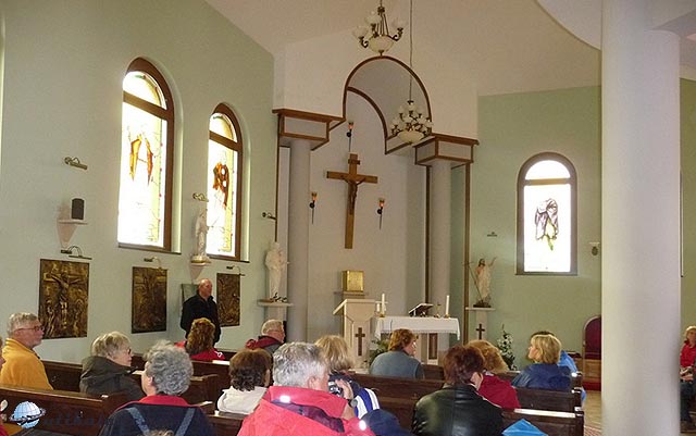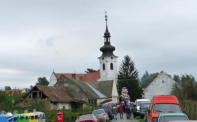 A patakmalomból aztán egyenesen mentünk Udvarba, a határátkelőre, ahol igazán gyorsan vettük az akadályokat. Fél ötre Pélmonostorra érkeztünk, ahol a templomban várt ránk a Katolikus Nőegylet. Itt szembesültünk először a szerb – horvát háború okozta sebekkel. A hölgyek beszédében a „háború előtt” a szerb-horvát háborút megelőző időt jelentette, a „békés visszatérés” kifejezés pedig a szerb megszállás végét, amikor a NATO vezetésével végre csatlakozhattak Horvátországhoz. Pélmonostor (Beli Manastir) a magyar határhoz közel fekszik, a határállomástól 17 km-re. Az esőben is végig látható volt a Baranya-hát vagy Báni-hegy lapos dombvonulata, melynek a keleti végénél fekszik Pélmonostor. A vonulat másik vége a Dunánál ér véget, Kiskőszegnél. Oda a harmadik napon jutottunk el. A dombvonulatot uralja a legmagasabb pontján (245 m) épült hatalmas tv torony. Pélmonostorig vezető útról jól látszott a magyar oldalon lévő Nagy harsány-hegy is. A közbülső falvakban és Pélmonostorban gyakori látvány a háború okozta sebek: kiégett, szétlőtt, romos, elhagyott házak.