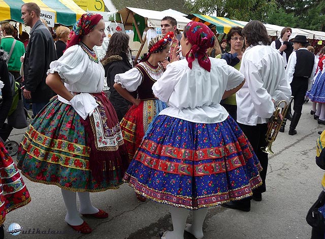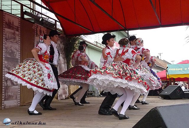 , szemre vettük a kínálatot: szabványos kínai vicik-vacak mellett helyi pirospaprikát lehetett kapni, kulent (vastag bélbe töltött paprikás hús), szalámit, helyi pálinkát, minden létező gyümölcsből, kóstolóval. Sajnos semmi nyoma a valahai kopácsi népművészetnek, a finom hímzésű főkötőknek, pedig a helyi hímzésnek, viseletnek valaha a néprajzosok csodájára jártak. Csak a helyi tánccsoport kötényén találkoztam a jellegzetes drávaszögi hímzéssel. (jobbról)