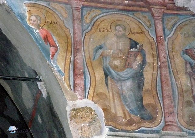 A templom legérdekesebb része a festett ikonok és freskómaradványok. Nagy valószínűség szerint az ikonosztáz ikonjait és a freskókat azonos festő készítette. Jól látható az eredetileg épített (mára elbontott) freskókkal díszített ikonosztáz, és a meglévő, épített kapuk egysége. A „Majsi mester” munkája ötvözi az ortodox hagyományokat a nyugati műveltséggel, és keze alól nagyon élő képek kerültek ki, amelyek sérült mivoltukban is meggyőző erejűek.