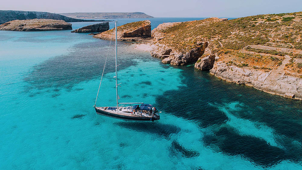 Comino nyugati oldalán található a „Kék lagúna” néven ismert gyönyörű öböl. Ahogy a neve is sugallja, az átható kék víz a legnagyobb vonzereje, amely rengeteg turistát vonz, hogy saját szemükkel is megnézzék a természet szépségét. A napsütés mágnesként vonzza a strandolókat, és ilyenkor megtelik a sziget, de ha kibírjuk estig, akkor már nyugodtan élvezhetjük a látványt. Amellett, hogy a partról meg lehet nézni a naplementét, vannak naplemente sétahajózások, amelyek alkonyatkor futnak ki a tengerre.