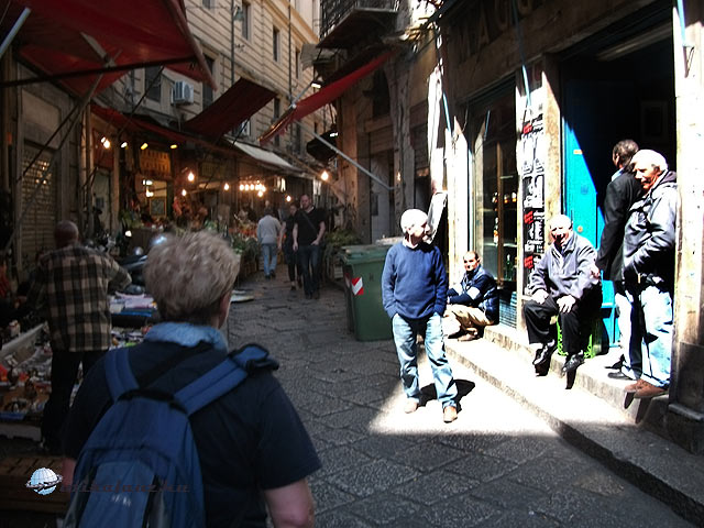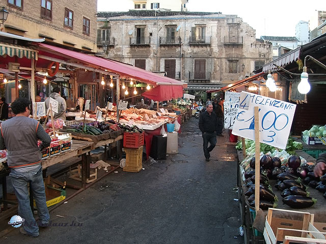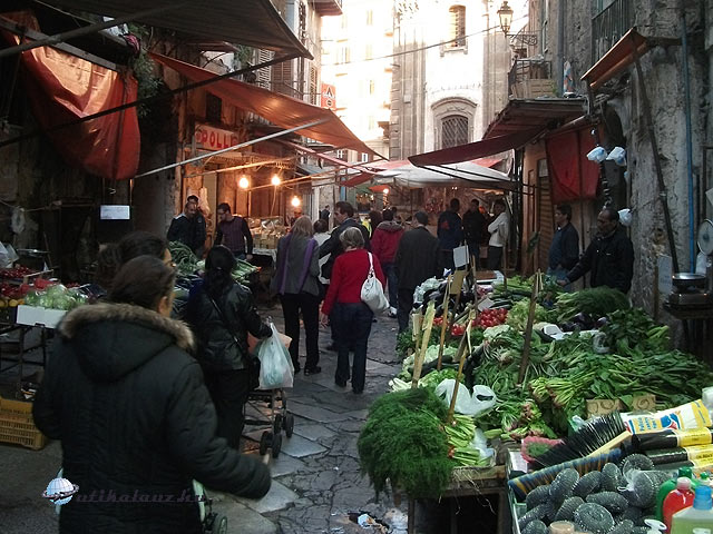 A piacok bejárása az Óvárosban mondhatni kötelező palermói program. A félelmetes hírű piacok közül kettőt különösebb izgalom és inzultus nélkül jártuk be, nappal, vagyis ilyen nézelődésre este vagy sötétben biztosan nem vállalkoztunk volna. A leghíresebbnek tartott Vucciria mellett nekünk jobban tetszett a Ballaro, mely a Corso Tüköryről indul egészen közel a főpályaudvarhoz. Rendkívül sűrű és hosszasan kanyarog szűk utcákon a katedrális irányába.