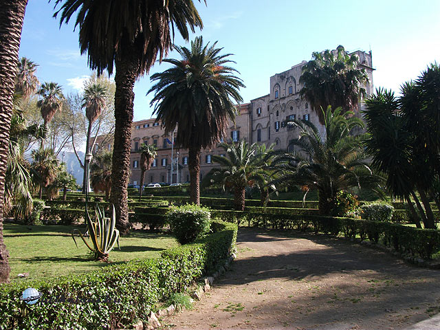 A Palazzo Reale, ahogy a Villa Bonanno parkból látszik