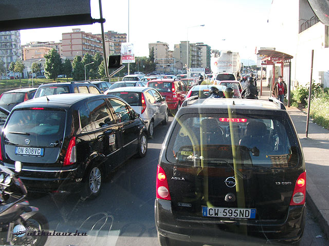 A másik eset is eléggé kellemetlen volt s megtépázta a palermói buszozás iránti frissen szerzett lelkesedésünket. Egy jó húzásnak tűnő ötlettel, hogy időt nyerjünk, az Indipendenza térről (egy szép, központi tér, melynek közelében a Palazzo Reale és a Porta Nuova is található) egy közvetlen járattal indultunk hazafelé. Nem tudtuk, hogy e járat a városon átvezető autóút melletti szerviz-úton próbálja átverekedni magát a délutáni csúcsforgalomban illetve, pontosabban, csúcsdugóban és ez közel másfélórás késést eredményezett.