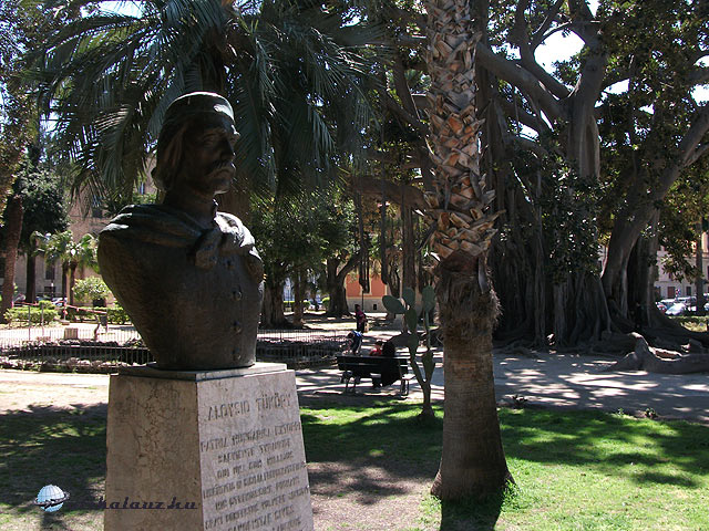 A Giordano Garibaldi egyébként egyik legszebb emlékünk Palermóból. Az 1863-ban épített park, – tervezője nyilván méltó emlékhelyet akart kialakítani a szabadságharc hőseinek-, tökéletes pihenőhelye lehet a palermói óváros bejárásában elfáradt turistának is. Többször is körbe sétáltuk, hogy megcsodáljuk a növényeket, különösen a park közepét uraló, óriási, hatalmasra nőtt, ezernyi gyökerű Ficus magnolioidest.
