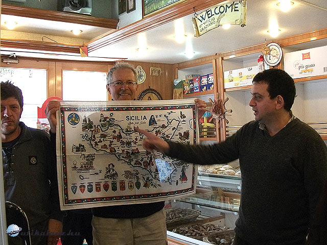 Fizetni nem engedtek. Ha már behívtak, próbáltunk közös témát találni. Így került szóba a magyar légió és Tüköry ezredes hőstette, amiről meggyőzően volt ismerete. Nem úgy tűnt, hogy csak a kedvünkért bólogat. Valószínűleg jól tanítják a történelmet a helyi iskolákban. Büszkén vallotta magát szicíliainak és lehet, hogy ezért, megkaptunk a Szicíliát ábrázoló terítőt ajándékba.